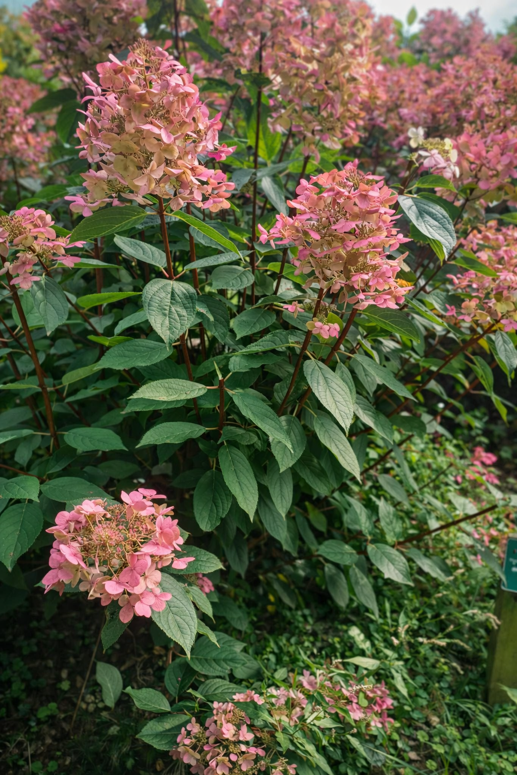 Deze krachtige, struikvormige hortensia groeit uit tot ongeveer 1,5 à 2 meter hoog en 1,5 meter breed. Hij vormt stevige takken, vaak met een roodachtige tint, die de grote bloempluimen moeiteloos dragen. Van juni tot aan de eerste vorst bloeit hij rijkelijk met indrukwekkende bloemen tot wel 25 cm lang. Ze openen wit, verkleuren naar zacht roze en evolueren uiteindelijk naar een diep rood in het najaar, vooral bij een zonnige standplaats .
